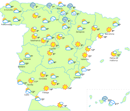 Udbredt frost i de indre egne og særligt koldt i bjergområderne, mens der også er lavinevarsel i flere egne. Der advares også om stærke vindstød på De Kanariske Øer.