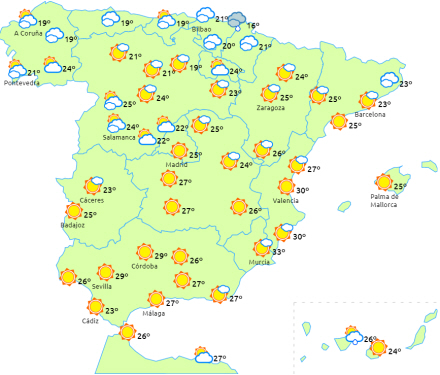 I resten af landet letskyet himmel efterhånden med flere skyer i de indre egne særligt i bjergene, og der kan komme nogle isolerede byger i de østlige af De Baleariske Øer.