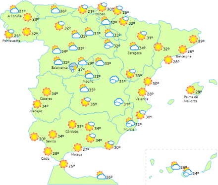 Varsler om høje temperaturer i Guadalquivir-dalen samt ved Guadiana, Tajo og Ebro, hvor særligt Córdoba og Jaén får det lunt. Derudover advares der om uvejr i bjergområder i centrum og det nordlige af halvøen.