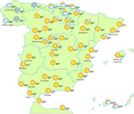 I dag varsles der perioder med stærk vind til de vestlige af De Kanariske Øer, men hovedrollen rent vejrmæssigt indtages fortsat af heden. Der advares i dag om meget høje temperaturer i områder af Ebro-dalen og Levante.
