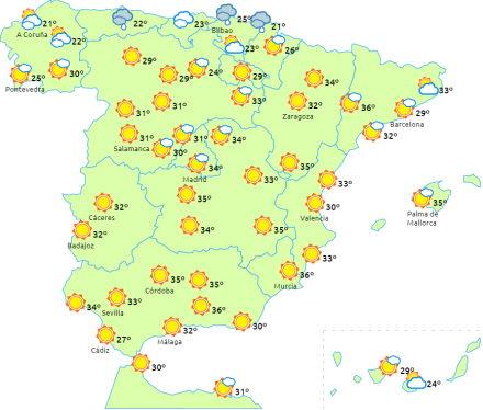Overskyet himmel med regn forventes i den nordlige del af Galicien og resten af de nordvestlige kystområder. Perioder med lidt uklarhed i løbet af dagen i de indre egne og bjergene på den østlige del af halvøen med mulighed for nogle regn- og tordenbyger i Pyrenæerne og De Iberiske Randbjerge.
