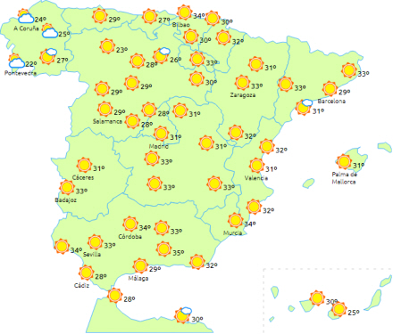 Letskyet eller klar himmel afbrudt af perioder med lavthængende morgenskyer ved kysterne i Castellón og Valencia. Temperaturer uændrede på 31 til 34 grader og 20 til 23 i nat.