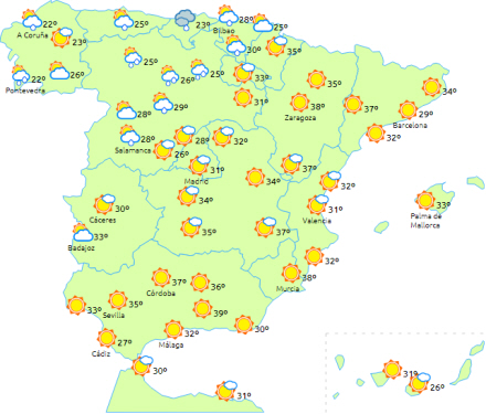 Høje temperaturer i det indre af den østlige tredjedel af halvøen, Balearerne og Gran Canaria. Lokalt kraftigt regn i det østlige kantabriske miljø er ikke udelukket.