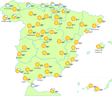 Stigende temperaturer i næsten hele landet undtagen i Galicien og halvøens sydvestlige hjørne, hvor de kun ændrer sig lidt. Stigningen vil være særligt bemærkelsesværdig i den øvre Ebro-dal, De Iberiske Randbjerge og det indre Catalonien. Rigtigt varmt bliver det på De Kanariske Øer og i fastlandets indre områder.