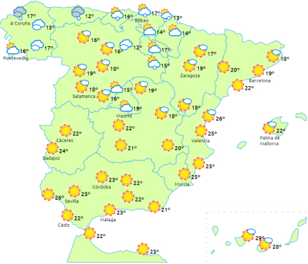 Letskyet eller klar himmel. Stigende dagstemperaturer, mens nætterne bliver en anelse køligere ved kysten og uden ændringer i de indre egne. Det betyder 22 til 25 grader og 10 til 14 i nat.