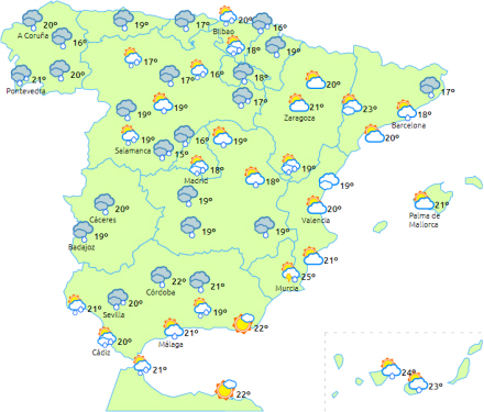 Dagstemperaturer vil falde i nordvest, Ebro-dalen og de nordøstlige af halvøen, mens de stiger i de indre egne, store dele af Andalusien og Levante-området. Om natten falder de i de vestlige og sydlige dele af halvøen og stiger generelt i resten.