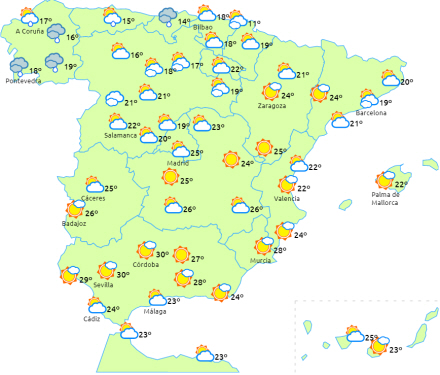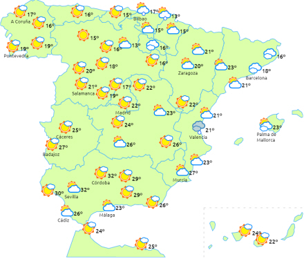 Stigende dagstemperaturer på den nordøstlige tredjedel af halvøen og de nordøstlige dele af De Baleariske Øer, og det vil være særligt mærkbart i dele af nordvestkysten, Ebro-dalen, Valencia og de nærliggende områder. Til gengæld vil de falde på den sydøstlige kyst. Få ændringer i resten og om natten.