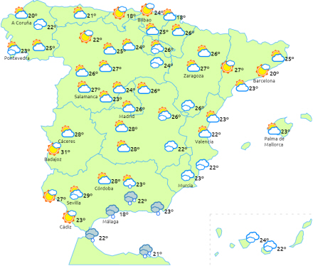 Stigende temperaturer i dagtimerne på den nordlige halvdel og De Baleariske Øer, mens de har tendens til at falde i Andalusien. Om natten lidt lunere på den nordlige halvdel.
