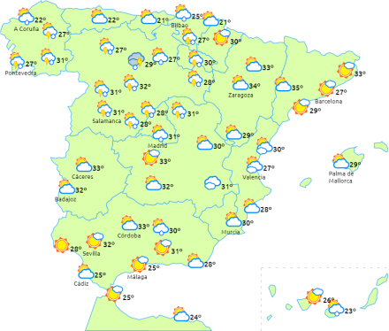 Faldende dagstemperaturer i den helt nordlige del af halvøen, mens de stiger i det sydlige Galicien og Middelhavsområdet og ellers kun få ændringer i resten. Nattemperaturerne er i let stigning i de indre og østlige egne af halvøen.
