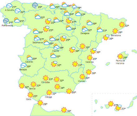 Dagstemperaturerne er uændrede eller svagt stigende. Nattemperaturerne falder i Galicien, mens de stiger langs nordvestkysten, den østlige tredjedel af halvøen, Andalusien og på Balearerne.