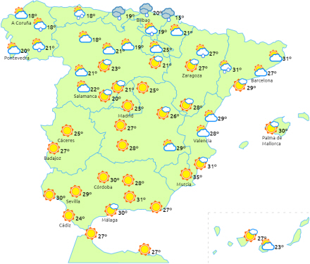 Dagstemperaturerne falder på det meste af halvøen, men vil dog stige i Middelhavsområdet og ramme meget høje niveauer i den sydlige del af Levante-området, lavtliggende områder på den nordøstlige del af halvøen og på Balearerne.