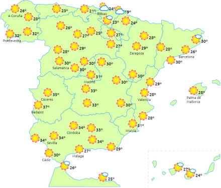 Temperaturerne vil fortsat stige på halvøen, undtagen ved Middelhavskysten og på Balearerne, hvor de forbliver uændrede. Lette fald på De Kanariske Øer.
