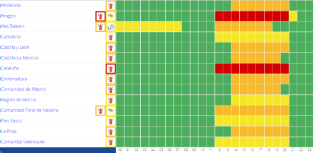 Temperaturerne har tendens til at stige i det meste af den østlige og sydlige del af fastlandet og på Balearerne. Temperaturen kan overstige 36 til 38 grader i store dele af halvøens indre egne og på Mallorca samt 40 til 42 grader i lavtliggende egne på den sydlige Atlanterhavsside og i Ebro-dalen.