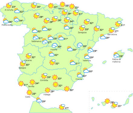 I de fleste dele af landet forventes tørt og solrigt vejr med letskyet eller klar himmel i dagens første halvdel, dog med lavtliggende skyer om morgenen på kysten og i dele af Galicien, det vestlige Asturien, langs Alboran-kysten og de nordlige egne af De Kanariske Øer.