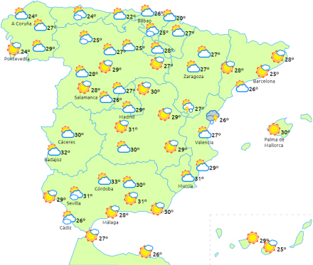 Dagstemperaturerne stiger på Atlanterhavssiden og den nordlige tredjedel, mens de falder på den sydøstlige del af halvøen og resten af halvøen med små ændringer. Dagstemperaturerne kan nå op på 34 grader i Guadalquivir og lokalt i dalene på resten af den sydlige Atlanterhavsside.