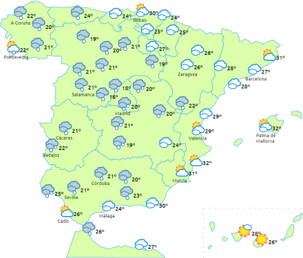 Dagstemperaturerne vil falde over næsten hele linjen, men mere markant i halvøens indre egne. Temperaturerne vil dog stige på Balearerne.