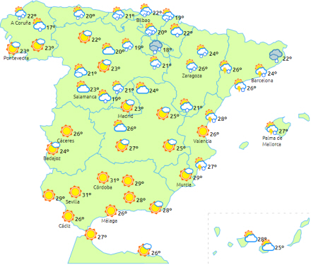 En atlanterhavsfront, der påvirker den nordlige og østlige del af halvøen og Balearerne, svækkes i begyndelsen af dagen, men reaktiveres, når den når Middelhavsområdet.