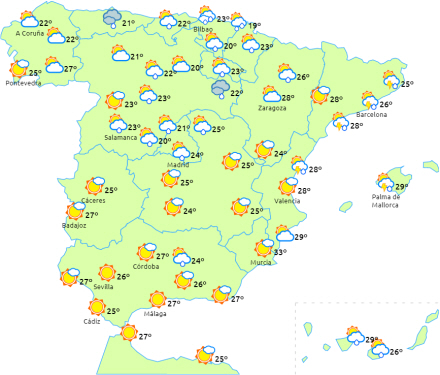 Atlanterhavsfront vil fortsat påvirke den nordligste del af halvøen og Balearerne, men generelt med mindre intensitet end de foregående dage. Der forventes overskyet vejr med byger og tordenvejr i disse områder, som lokalt kan være kraftige i den østlige ende af nordvestkysten i dagens første halvdel og omkring Pyrenæerne om eftermiddagen.