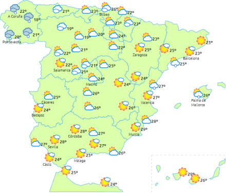 Dagstemperaturerne stiger i den nordøstlige tredjedel af halvøen, mens de falder i Galicien og det vestlige Andalusien og kun ændrer sig lidt i resten. Nattetemperaturerne sker der ikke meget med.