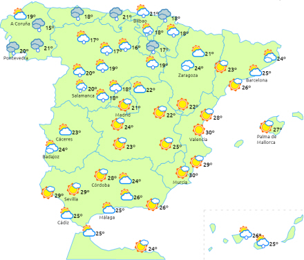 En front, der den foregående dag krydsede halvøen fra vest til øst, vil stadig påvirke det østlige Middelhavsområde tidligt om morgenen med overskyet vejr, byger og enkelte tordenbyger, som lokalt kan være kraftige eller meget kraftige på Balearerne og i den østlige del af Catalonien med tendens til opklaring i løbet af eftermiddagen.