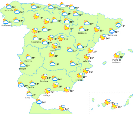 Dagstemperaturerne vil falde ved nordvestkysten, Pyrenæerne, den østlige tredjedel af halvøen og lokalt markante fald i Middelhavsområdet og på De Kanariske Øer, mens de vil være uændrede i resten af landet. Nattemperaturerne vil falde i det meste af landet.