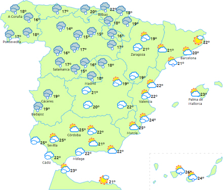Faldende dagstemperaturerne i Galicien, De Cantabriske Bjerge og Pyrenæerne og stigende i de sydøstlige, indre egne, mens der ikke sker meget i resten af landet. Nattemperaturerne vil falde på den sydøstlige del af halvøen og Balearerne og stige i nord. Svag frost i Pyrenæerne.