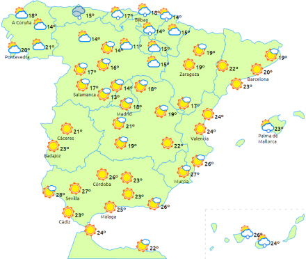 Letskyet til klart. Nattemperaturerne er uændrede, mens dagstemperaturerne stiger ved kysten og i Guadalhorce-dalen, og de er uændrede i resten af provinsen. Dermed havner vi på 26 til 32 grader og 13 til 18 i nat. Vind fra vest, der er tiltagende i løbet af dagen.