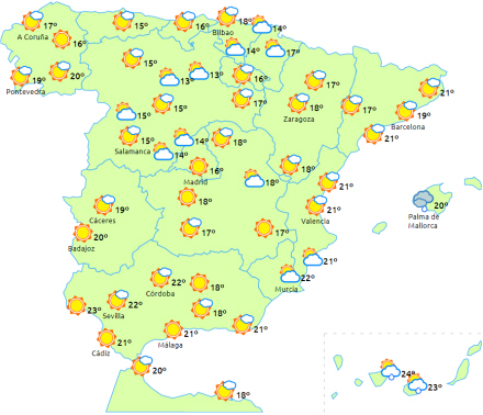 Dagstemperaturerne vil generelt stige, selv om der i den vestlige del af Galicien og i lavtliggende områder i den nordøstlige del af halvøen kun forventes ringe ændringer eller lette fald. Nattemperaturerne vil stige på den nordøstlige del af halvøen og falde på den nordvestlige. Svag frost på den nordlige højslette og spredt frost i de omkringliggende bjerge og mere intens frost i Pyrenæerne.