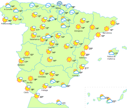 I den nordøstlige del af Galicien, ved nordvestkysten og i den nordlige del af De Iberiske Randbjerge er det overskyet med let nedbør, men med tendens til at aftage efterhånden.