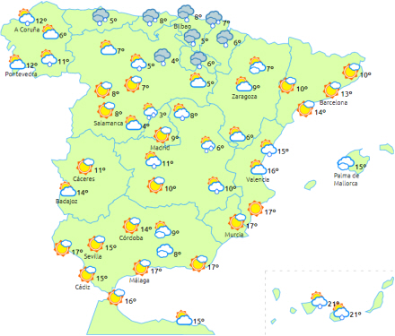 Skyet eller overskyet med stedvis vedvarende regn i den nordlige del af Galicien, ved nordvestkysten og det nordlige Navarra, som i svagere form kan brede sig til resten af den nordlige del af Den Iberiske Halvø.