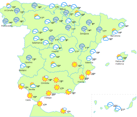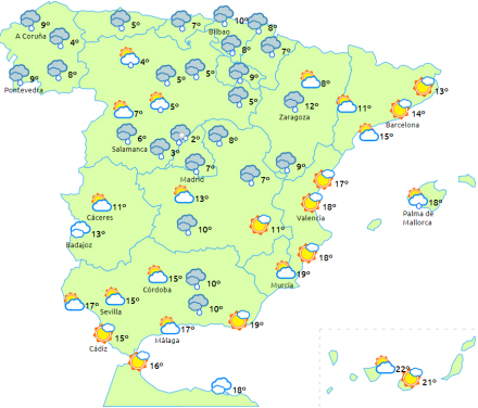 Temperaturerne vil generelt stige lidt, bortset fra minimumstemperaturerne i det nordligste område, hvor de vil falde. Frost i bjergene på den nordlige tredjedel af halvøen og i sydøst - mere intens i Pyrenæerne. Kun få ændringer på De Kanariske Øer.