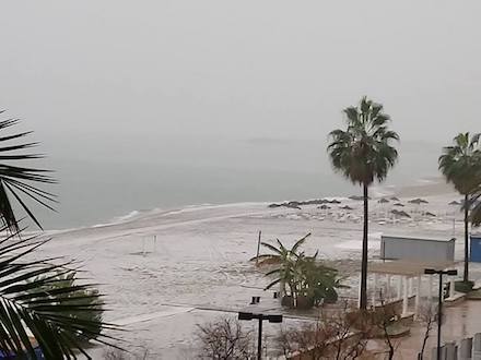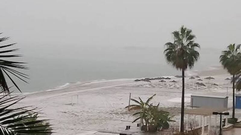 VEJR: Vinteren har i dén grad fundet vej til Spanien, der i dag får masser af det hele. Herover kan du se et sjældent syn fra Fuengirola, Málaga med hagl på stranden fra i dag.