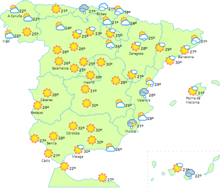 I den østlige ende af den nordlige Atlanterhavskyst og den galiciske kyst er det overskyet i perioder, og der kan komme nogle svage og spredte byger. I Navarra, Aragon, Catalonien og bjergene i nord er det samme sag, men her advares der også om torden, og lokalt tung nedbør med hagl, men det klarer op senere på eftermiddagen.
