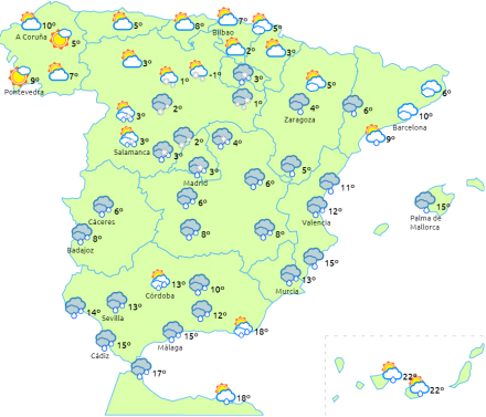 Natniveauerne vil dog stige kraftigt på halvøen og De Baleariske Øer. Generelt svag frost i den nordlige halvdel og det indre af halvøen, koldere i de højtliggende områder. Få ændringer på De Kanariske Øer.