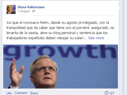 Næstformand for det socialistiske parti, Elena Valenciano, raser mod formanden for EU-kommissionens økonomiudvalg, Olli Rehn, for sit forslag om, at ”spanierne bør gå ti procent ned i løn for at redde landets økonomi”.