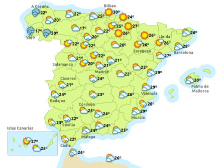 Madrid får regn det meste af dagen og mellem 16 og 23 grader. Barcelona undgår regn får mellem 21 til 26 grader, Valencia delvist skyet med regn og 21 til 31 grader, Málaga får en smule regn, men det klarer op senere på dagen og temperaturerne ligger mellem 21 og 27 grader, og Palma de Mallorca får letskyet vejr og 22 til 30 grader.