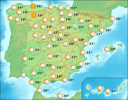 I Madrid er temperaturen også steget, dog mere moderat til mellem ti og 21 grader, Barcelona 12 til 19 grader og Valencia 14 til 20.
