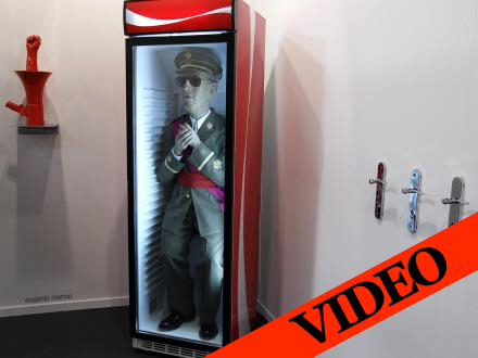 Værket er kreeret af den spanske kunstner Eugenio Merino og viser generalen med bøjede knæ iført en grøn uniform og mørke solbriller i et køleskab i Coca-Cola-lignende stil.