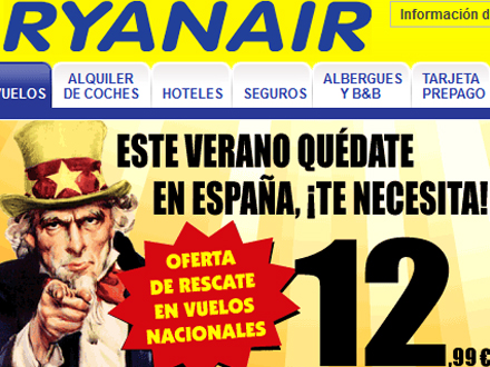 Det er ikke kun amerikanske mangemillionærer, der forstår at udnytte krisen i Spanien. Flyselskabernes frække gadedreng Ryanair forstår at spare reklamepenge gennem sine kreative annoncer, der - som her - bliver omtalt i alverdens medier.