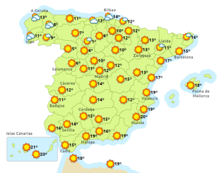 Mallorca er vågnet op til solskin som mange andre spaniere i dag. Og so så mange andre steder, kan øboerne nyde solen hele dagen uden at blive forstyrret af skyer. Der bliver mellem 9 og 19 grader varmt.