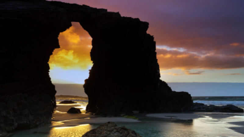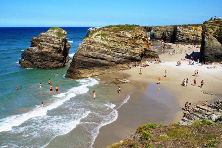 Praia da Catedrais, som betyder ”katedralens strand” på galicisk, eller La playa de las Catedrales på spansk, efterlader de besøgende i dyb ærefrygt på grund af dens gigantiske bue-lignende klippeformationer og dybe grotter, der når helt ud til vandkanten.