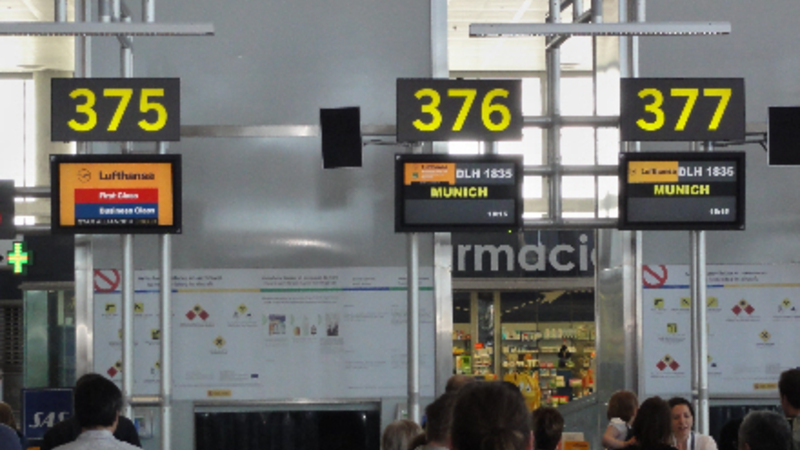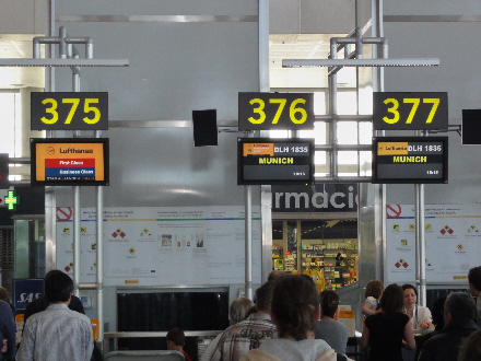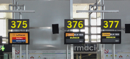375: First og Business, 376: Baggage Drop, 377: Almindelig checkin