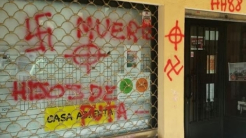Partiets kontor i San Lorenzo del Escorial blev lørdag overmalet med nazi-symboler og ordene: ”Død over Pablo Iglesias” og ”Ud med de røde”.
