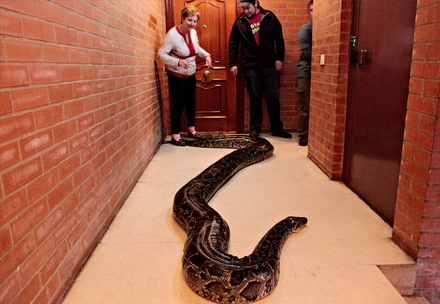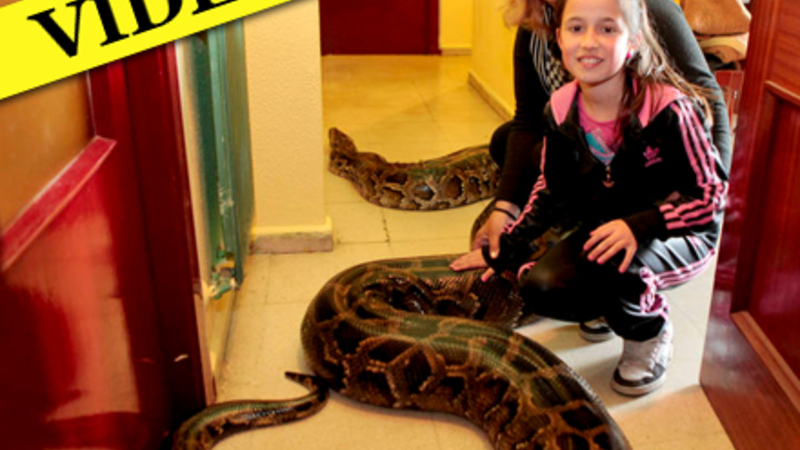 Den imponerende slange, Tundra, der er hele fem meter lang, bor til daglig sammen med sin spanske familie Miguel Huete og Mercedes Antón i en lejlighed i Calle Médico Félix Prieto