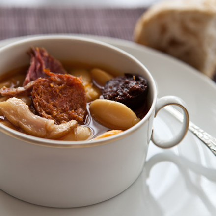 Læg bønnerne i blød natten over. Skær pølser og kød i passende stykker og svits dem hurtigt i olivenolie sammen med safran, snittet hvidløg, laurbærblade og paprika. Kom bønnerne i en gryde med vand eller hønsebouillon, så det dækker godt og vel. Bring det langsomt i kog. Skum undervejs. Lad bønnerne simre i en halv times tid. Kom kødet i sammen med stegeskyen, og lad det hele simre, indtil alt er mørt.