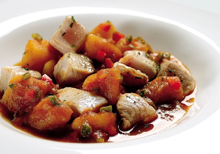 Skær løg og hvidløg i små stykker, og steg dem ved svag varme i olivenolie. Når det er færdigt (løget må ikke få farve), tilføjer du stærk paprika og et minut efter lidt hvedemel. Rør det hele godt sammen og kom det i gryden sammen med grønsager og kød. Retten koges videre ved svag varme. Smag til med salt.
