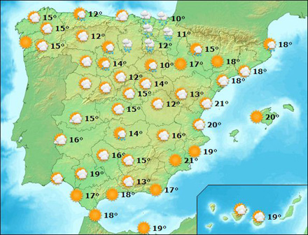 Snegrænsen ligger i dag på mellem 1.300 og 1.500 meter i den nordlige del og på mellem 1.500 og 1.700 meter i resten. Der kommer i dag nogen nedbør i den nordøstlige del og i dele af Centralspanien. I Pyrenæerne kan der komme sne.