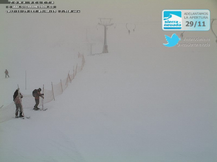 I dag starter skisæsonen på Sierra Nevada, og allerede klokken lidt i ni i morges var de første skifolk på vej. Hvis du klikker i billedet, kan du se billeder fra forskellige steder på Sierra Nevada, og de bliver opdateret flere gange i timen.