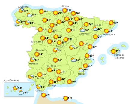 Madrid tager et skridt væk fra det sommerlige vejr, der har været i det meste af landet på det seneste. Resten af dagen bliver der overskyet, men dog temperaturer på 12 til 25 grader.