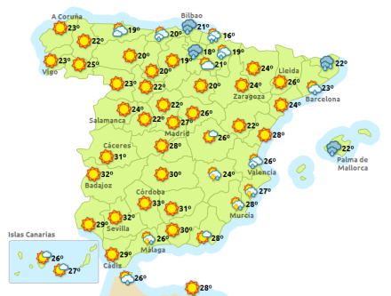 I Madrid er det ret solrigt med mellem 16 og 31 grader, i Barcelona mest skyet og byger med 20 – 25 grader, i Valencia også ret skyet og her med byger og mellem 22 – 29 grader, og Málaga efterhånden klart og solrigt med 24 – 29 grader.